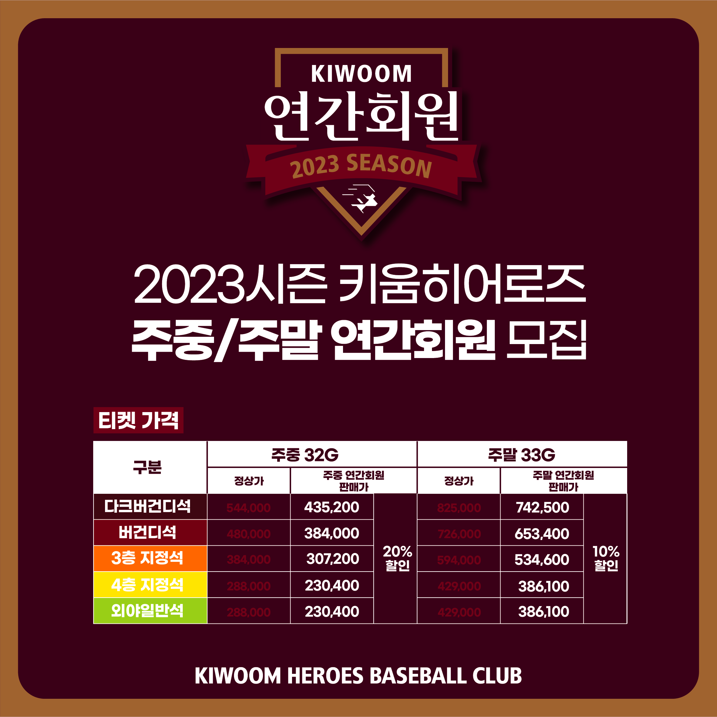 프로야구 키움(대표이사 위재민)이 오는 22일부터 3월 5일까지 2023시즌 주중, 주말 연간회원 및 멤버십 회원을 모집한다.