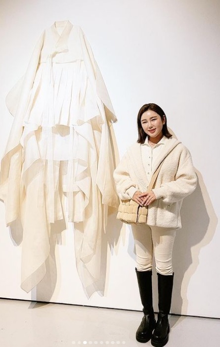 공개된 사진에는 한복 전시회를 방문하여 밝은 미소를 띠고 있는 송가인의 모습이 담겨 있다.
