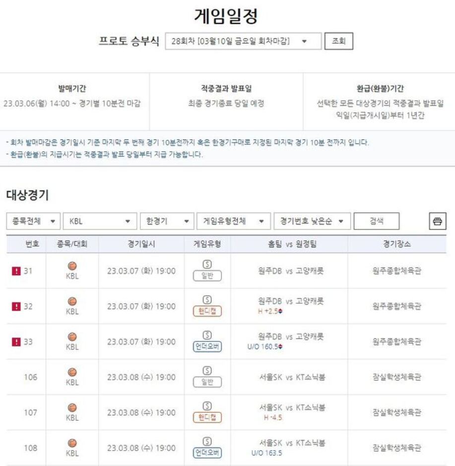 ‘국내 농구팬들을 위해 KBL 주중 빅매치를 대상으로 프로토 승부식 한경기구매 게임이 발매됩니다.’