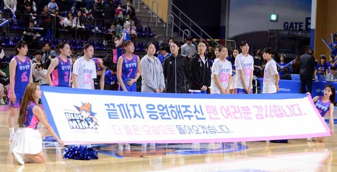 여자프로농구 삼성생명 선수들이 14일 용인체육관에서 열린 '신한은행 쏠 2022-2023 여자프로농구 플레이오프 ' BNK썸과의 경기에서 패한 뒤 팬들에게 인사를 하고 있다.