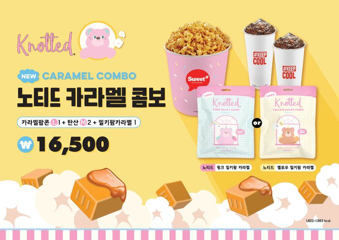 더불어 ‘노티드 카라멜 콤보’ 구매시에만 제공되는 팝콘 패키지 또한 MZ세대들에게 인기를 끌고 있는 ‘노티드(Knotted)’만의 인스타그래머블한 디자인이 적용됐다. ‘노티드(Knotted)’의 대표 마크인 스마일 캐릭터에 슈가베어 캐릭터가 팝콘을 들고 있는 제스처를 담아 ‘노티드(Knotted)’를 대표하는 파스텔톤 노랑과 핑크 컬러로 아기자기하면서 극장 팝콘통의 직관적인 느낌을 더해 관객들에게 영화관 먹거리에 대한 즐거움과 신선함을 제공한다. 독창적이고 트렌디할 메뉴가 될 ‘노티드 카라멜 콤보’ 판매 영화관 리스트 및 자세한 사항은 롯데시네마 홈페이지 및 애플리케이션에서 확인 가능하다.