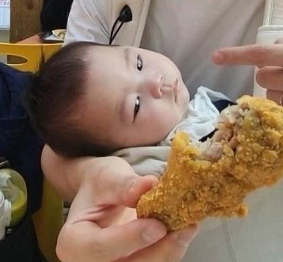 사진 속 준범이는 아빠 제이쓴의 품에 안긴 채 귀여운 얼굴로 치킨을 쳐다보고 있다.