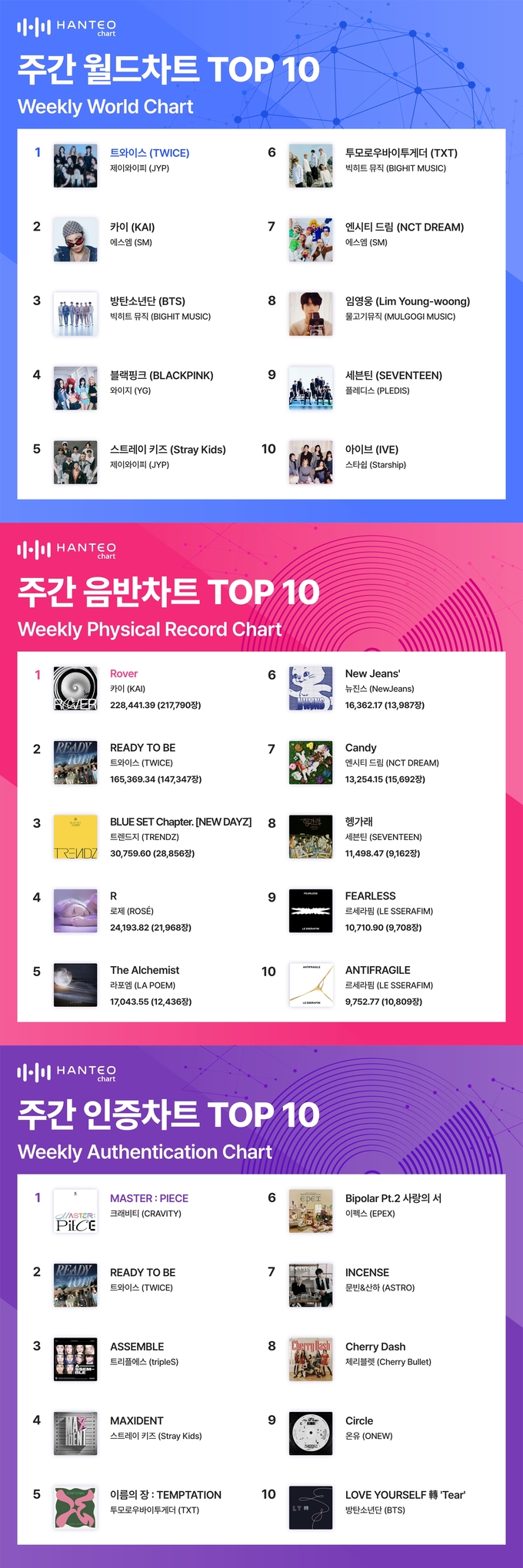 한터차트의 3월 3주 차 주간 차트 집계 기간은 지난 13일부터 20일까지다. 월드차트는 케이팝 아티스트의 글로벌 데이터를 바탕으로 발표되고, 음반차트는 전 세계 음반 판매량을 바탕으로 한 음반 지수를 기준으로 순위가 발표된다. 인증차트는 해외 팬들의 정품 앨범 인증량을 기준으로 한다.