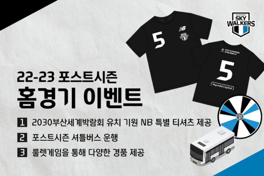 먼저 ‘2030 부산세계박람회’ 유치 기원 캠페인에 동참하기 위해 특별 제작 티셔츠를 홈팬들에게 제공한다. 구단은 부산세계박람회 기원 문구가 새겨진 뉴발란스(New Balance) 티셔츠 2000장을 유관순체육관 1, 2층 홈 응원좌석을 구매한 관중들에게 제공할 예정이다.