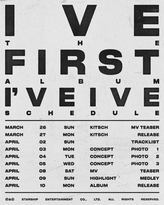 스케줄러에 따르면 아이브는 오는 26일(일) 프리 릴리즈 곡인 ‘Kitsch(키치)’ 뮤직비디오 티저를 공개한 이후, 27일(월) 'Kitsch'를 전격 발매하며 컴백 예열에 나선다. 신보 'I’ve IVE'의 4월 10일(월) 발매 일정에 맞춰 2일(일)에는 트랙리스트를 공개하고, 3일(월)부터 5일(수)까지는 콘셉트 포토를 공개한다. 또 8일(토) 타이틀곡 뮤직비디오 티저, 9일(일) 하이라이트 메들리를 선보이며 컴백 열기를 끌어올린다.