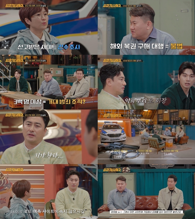 이들이 소개한 첫 번째 에피소드는 ‘용감한 형사들’ 역사상 가장 많은 피해자를 만든 사건이었다. 2022년 4월, 복권업체 직원이 윤희동 형사에게 로또 당첨 사실을 조작하고 거짓 광고를 통해 돈을 버는 로또번호 예측 사이트를 수사해달라고 의뢰했다. 실제 사이트에는 1등 당첨번호 인증과 후기, 거래내역서 등이 가득했다. 이를 보고 회원가입을 하는 순간 빠져나갈 수 없는 덫에 갇히게 되는 것.
