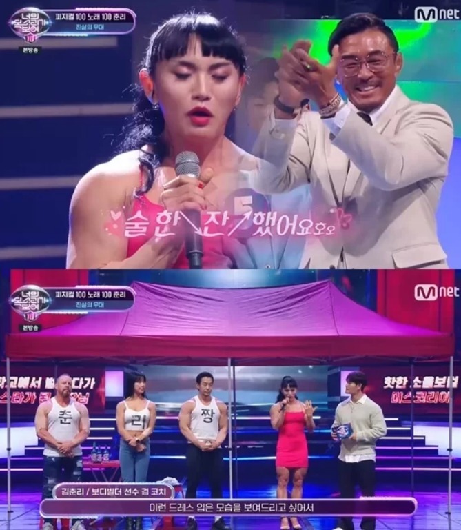 ‘피지컬 100’에 출연했던 보디빌더 춘리가 드레스를 입고 당당하게 무대를 꾸몄다.