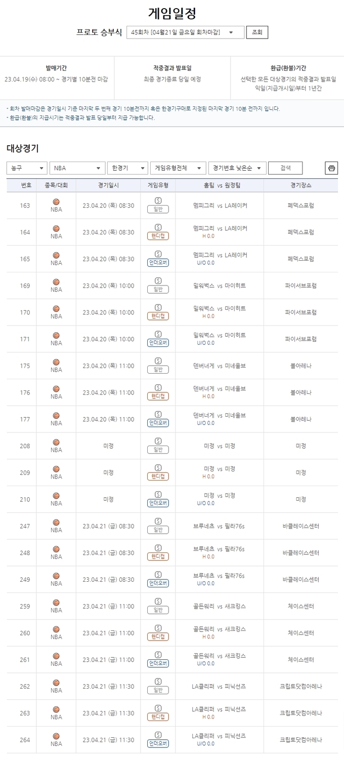 프로토 승부식 45회차 중 NBA플레이오프를 대상으로 하는 한경기구매 게임은 20일 오전 8시 30분에 페덱스포럼에서 경기를 갖는 멤피스-LA레이커스(163~165번)전을 시작으로 밀워키-마이애미(169-171번), 덴버-미네소타(175-177번), 브루클린-필라델피아(247~249번), 골든스테이트-새크라멘토(259~261번), LA클리퍼스-피닉스(262~264번)전 등이 대상경기로 지정됐다.