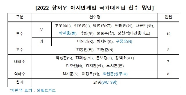 KBO(총재 허구연)와 대한야구소프트볼협회(회장 이종훈)는 9일 2022 항저우 아시안게임에 출전할 야구 국가대표팀 선수 24명과 코칭스태프의 명단을 발표했다.