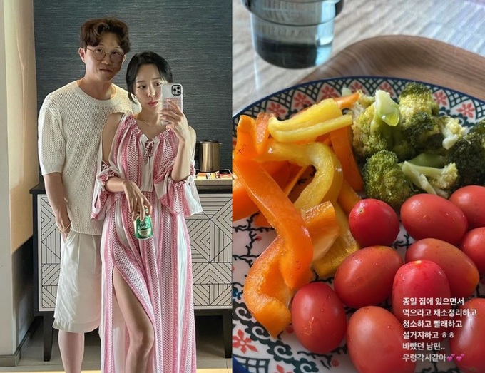 공개된 사진은 그릇에 놓인 평범한 채소 사진. 이솔이는 “종일 집에 있으면서 먹으려고 채소 정리하고 청소하고 빨래하고 설거지하고 ㅎㅎ 바빴던 남편. 우렁각시 같아”라는 글을 덧붙이며 남편에 대한 애정을 드러냈다.