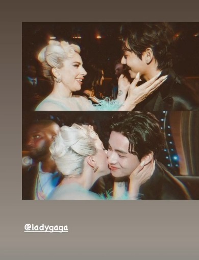 방탄소년단(BTS) 뷔가 팝스타 레이디 가가에게 볼키스를 받으며 영화 같은 장면을 연출했다.
