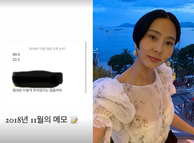 공개된 사진은 2018년 11월 29일에 작성한 메모로, “절대로 이렇게 주저앉지는 않을 거야”라는 글이 적혀있다. 이는 전 남편 A씨의 사기 혐의를 받았을 때의 심경으로 풀이된다.