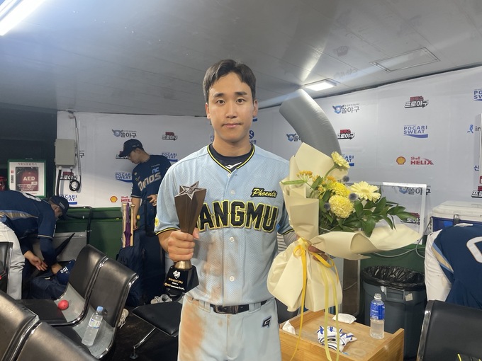 ‘축제의 무대’를 맘껏 즐겼다. 내야수 구본혁(26·상무)이 호쾌한 스윙을 자랑했다. 14일 부산 사직구장에서 열린 ‘2023 신한은행 SOL(쏠) KBO리그 퓨처스 올스타전’에 남부리그 소속으로 5번 및 유격수로 선발 출전했다. 홈런 한 개를 포함해 4타수 2안타 2타점 1득점을 마크, 펄펄 날았다. 비록 승리로 이어지진 않았지만(7-9) 충분히 인상적인 활약이었다. 감투상에도 선정됐다. 상금 100만원과 트로피를 품었다. 구본혁은 “생각도 못한 상이라 기분 좋다”고 웃었다.