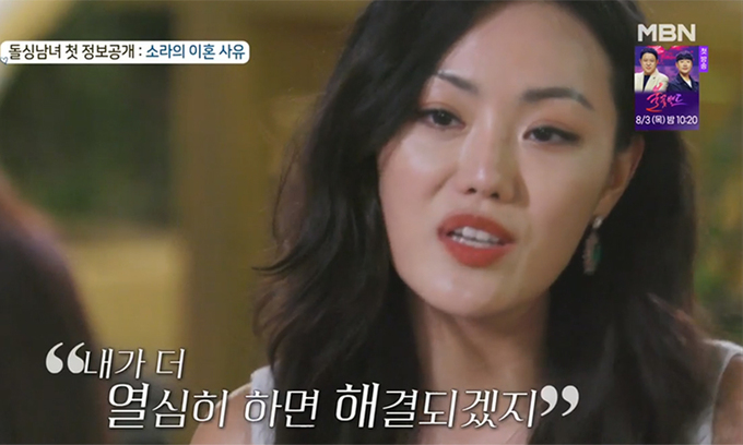 소라는 “나는 이혼사유가 가정폭력이었다”고 밝혀 놀라움을 안겼다. 그는 “내가 성공할수록 전남편은 자존감이 떨어져서 나를 항상 떨어뜨리려고 했다. 밖에 못 나가게 차 키도 숨겼다. 언젠가 내가 갑자기 잠에 깬 사람처럼 ‘내가 왜 이렇게’ 생각이 들었다”고 회상했다.