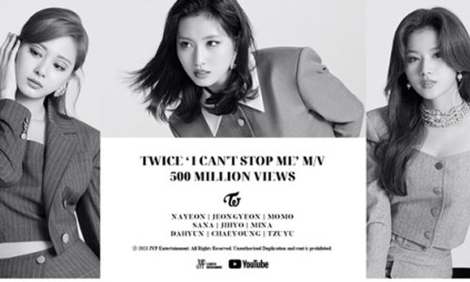 그룹 트와이스가 'I CAN'T STOP ME'(아이 캔트 스톱 미) 뮤직비디오로 통산 여섯 번째 5억 뷰 돌파 기록을 세웠다.