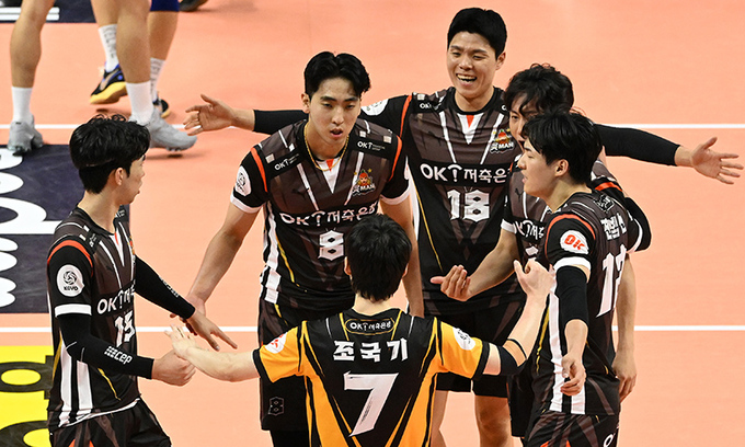 6일 경북 구미 박정희체육관에서 막을 올린 컵대회 남자부 A조 조별리그 두번째 경기에서 OK금융그룹이 KB손해보험을 세트 스코어 3-0(25-17 25-22 25-11)으로 완파했다.
