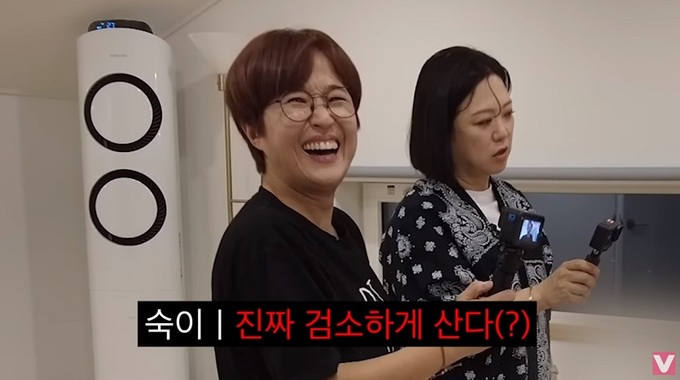 영상에는 코미디언 후배 김숙이 송은이의 집을 방문한 모습이 담겼다. 이날 김숙은 “언니 집 너무 좋다. 송은이 돈 벌었네. 저 TV 큰 거 봐라”고 부러움을 드러냈다. 가장 먼저 화장실을 구경한 김숙은 “화장실 층고가 높다. 그리고 출입문과 (양변기) 사이가 넓다. 무릎을 부딪힐 일이 없다”고 했다. 평소 캠핑을 좋아하는 송은이는 방 하나에 캠핑 도구를 정돈해 놓은 팬트리를 선보였다.