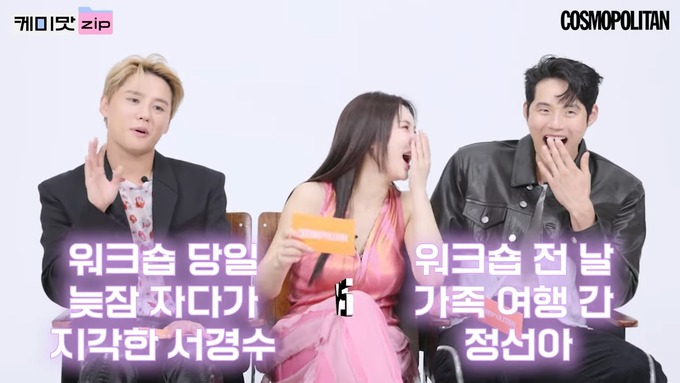 영상 속 김준수는 “워크숍 당일 늦잠 자다가 지각한 서경수vs워크숍 전날 가족여행 간 정선아”라는 밸런스게임에 전자를 택했다. 그는 “왜냐하면 어쨌든 왔잖아”라며 “(후자는) 연락도 없이 안 왔다는 거잖아요. 그래도 온게 낫죠”라고 답했다. 그의 진지한 답변에 정선아는 “제가 그런 적이 있는 거 같은 느낌이에요”라며 웃었다.