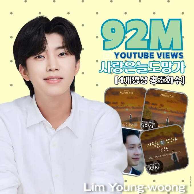 4일 임영웅의 첫 OST ‘사랑은 늘 도망가’ 뮤직비디오와 공식 오디오 영상, 가사 영상, 음원 영상 총 조회수가 9200만 뷰를 돌파했다. 지난 8월 20일 9100만 뷰 달성 후 16일 만에 또 새로운 기록을 썼다.