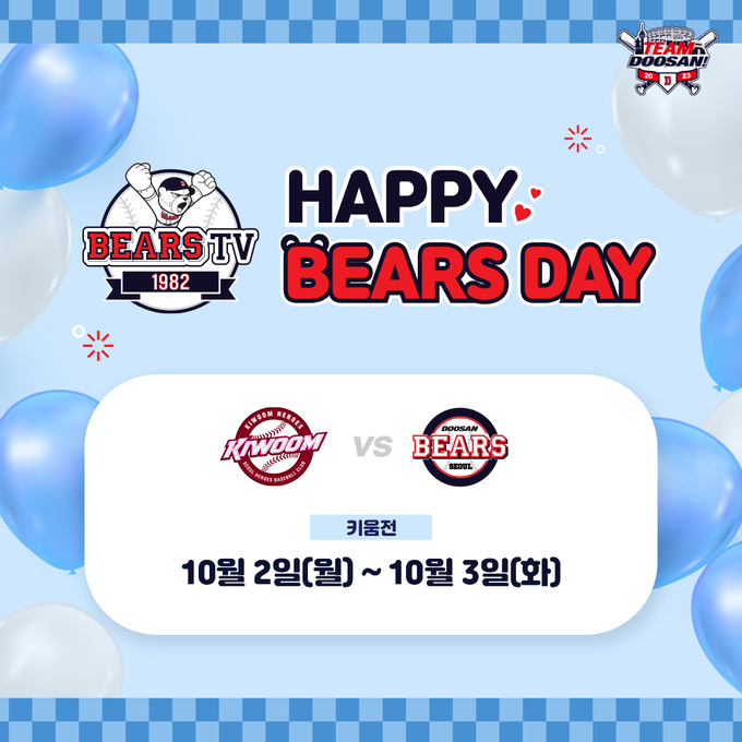 두산이 10월 2일부터 3일까지 잠실야구장에서 열리는 키움과의 정규시즌 맞대결에서 ‘해피 베어스데이(HAPPY BEARS DAY)’ 이벤트를 진행한다고 22일 밝혔다.