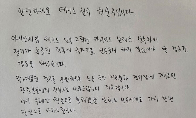 항저우 아시안게임에 출전하고 있는 테니스 남자 국가대표 권순우(26·당진시청)가 자필 사과문을 발표했다. 지난 25일 펼쳐진 대회 남자 단식 2회전에서 발생했던 자신의 ‘비매너 논란’에 대한 사과였다.