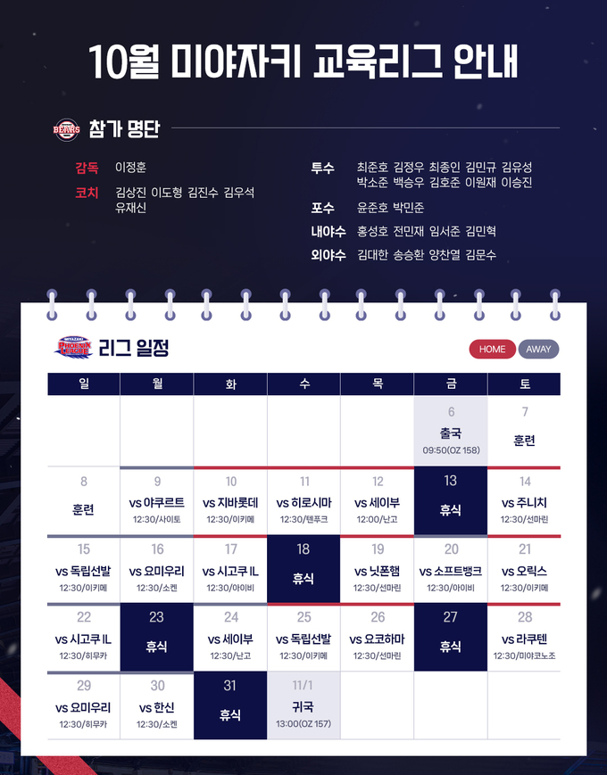 이정훈 감독이 이끄는 선수단은 코칭스태프 6명, 선수 20명으로 구성됐다. 투수조는 김민규 최준호 등 10명이다. 내야수 홍성호, 외야수 김대한, 포수 윤준호 등도 참가한다.