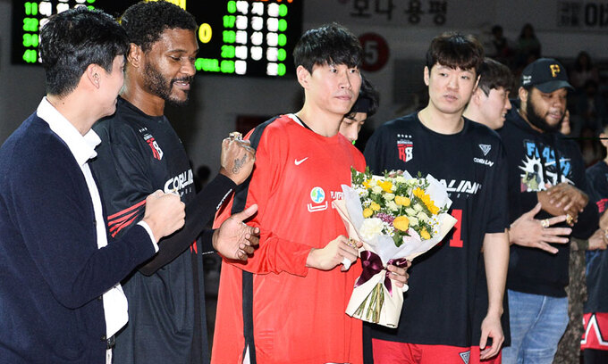 경기에 앞서 통합 우승 반지 수여식이 진행됐다. 정관장은 은퇴한 양희종을 비롯해 현재 상무에서 군 복무를 하는 변준형과 한승희까지 불러 의미 있는 시간을 가졌다. 이제는 상대 팀이지만 오세근도 통합 우승 반지를 받았다. 정관장은 오세근에게 꽃다발을 건네며 응원했다. 팬들도 오세근의 이름이 연호되자 큰 함성으로 반겼다. 김상식 정관장 감독은 “(오)세근이도 어색하겠지만 우리도 참 낯설다”고 아쉬워했다.