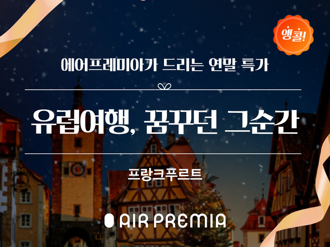 하이브리드 항공사 에어프레미아(Air Premia)가 연말시즌 프랑크푸르트 노선 특가 프로모션을 오는 27일까지 연장한다고 22일 밝혔다.