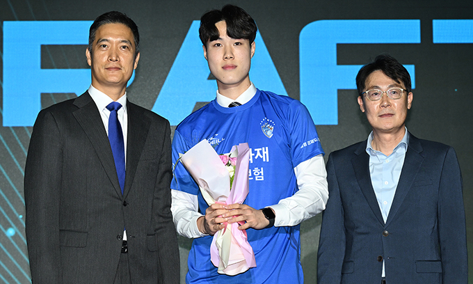 전체 1순위 영광은 경기대 2학년 아웃사이드 히터(OH) 이윤수가 차지했다. 빠른 스윙과 197㎝의 준수한 신장을 살린 타점 높은 공격이 장점이다. 부상 재활은 변수다. 지난 2023 문경 국제대학배구대회에서 발목을 다쳤다. 당장 활용할 수는 없지만 삼성화재는 그의 잠재력에 주목했다.