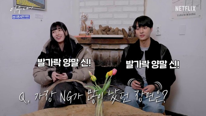 영상 속 두 사람은 “가장 NG가 많이 난 장면은?”이라는 질문에 입을 모아 “발가락 양말 신”이라고 답했다. 수지는 “웃음 참느라 너무 힘들었다”며 “저희가 NG를 거의 안 냈다”고 회상했다. 그러면서도 “근데 그때는 너무 웃겼다”며 두 사람 모두 입을 모아 덧붙였다.