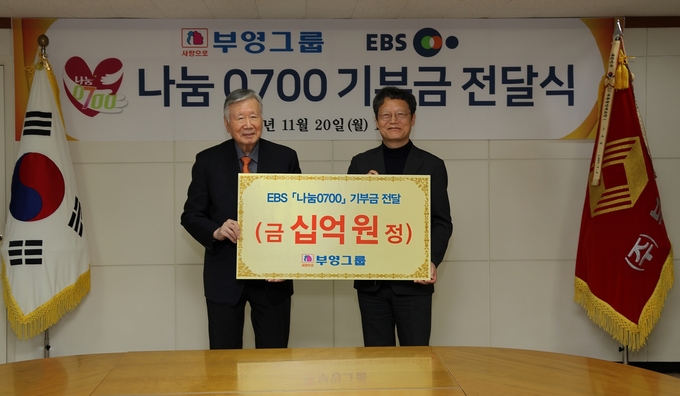 부영그룹이 EBS 사회공헌 프로그램인 ‘나눔 0700’에 올해도 10억원을 기부한다. 지난해 10억원 기부에 이어 누적 기부액만 20억원에 이른다.