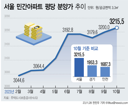 전월 502만3000원(3.3㎡당 1657만5900원)과 비교해 7만1000원 상승했다. 전년동월 456만2000원(3.3㎡당 1505만4600원)에 비해선 53만2000원 오른 가격이다. 또 2014년 평균 분양가격을 100으로 환산해 산출한 분양가격지수는 지난 10월 기준 196.1을 기록해 약 9년 만에 200선 돌파를 눈앞에 두고 있다.