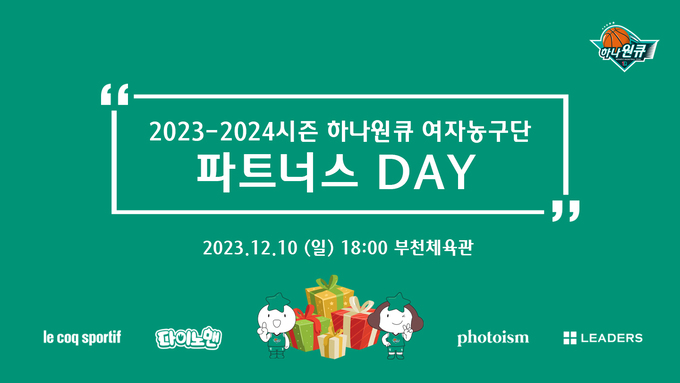 하나원큐는 9일 “10일 오후 6시 부천체육관에서 열리는 부산 BNK와의 홈경기를 ‘하나원큐 파트너스데이’로 진행한다”고 밝혔다. 이어 “구단과 함께 하는 파트너사들 및 연고지인 부천시에 감사의 의미를 담아 준비했다”고 덧붙였다.