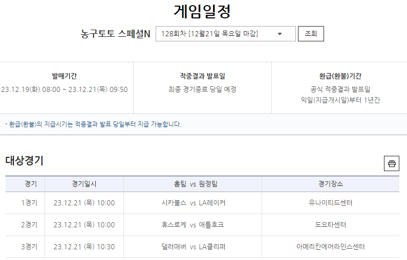 국민체육진흥공단이 발행하는 체육진흥투표권 스포츠토토의 수탁사업자 스포츠토토코리아가 2023~2024시즌 미국프로농구(NBA) 3경기를 대상으로 한 농구토토 스페셜N 128회차를 발매한다고 밝혔다.