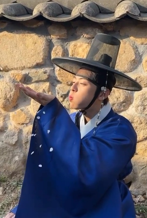 20일 차은우는 자신의 SNS에 “어추어추”라고 적으며 여러 장의 사진과 영상을 공개했다. 공개된 영상 속 차은우는 푸른 한복에 갓을 쓴 채 드라마 속 소품인 벚꽃잎을 후 불며 사랑스러운 포즈를 취했다.