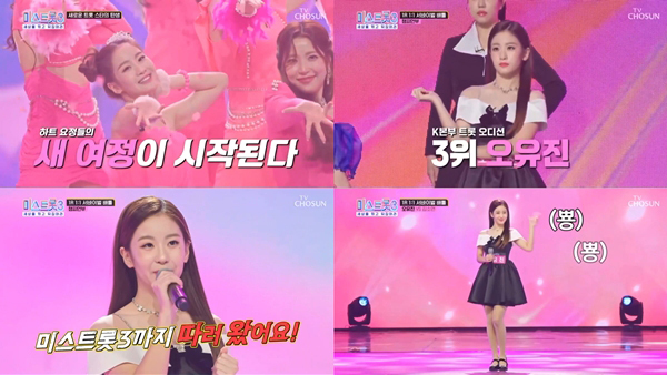 오유진은 지난 21일 방송된 TV조선 '미스트롯3' 첫 방송에 참가자로 출연해 시선을 사로잡았다. 오유진은 방송 전 공개된 오프닝 무대에서 바비 핑크 컬러의 드레스와 미니 티아라를 쓰고 사랑스러운 '트로트 프린세스'로 변신했고 센터 구역에 서 당당하게 퍼포먼스를 소화, 자신의 매력을 한껏 뽐냈다.