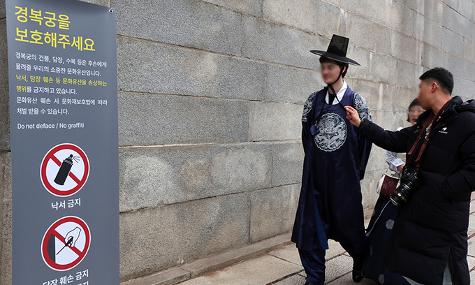 문화재청이 지난달 스프레이로 훼손된 경복궁 담장 복구 비용을 낙서범들에게 청구하겠다고 밝혔다.
