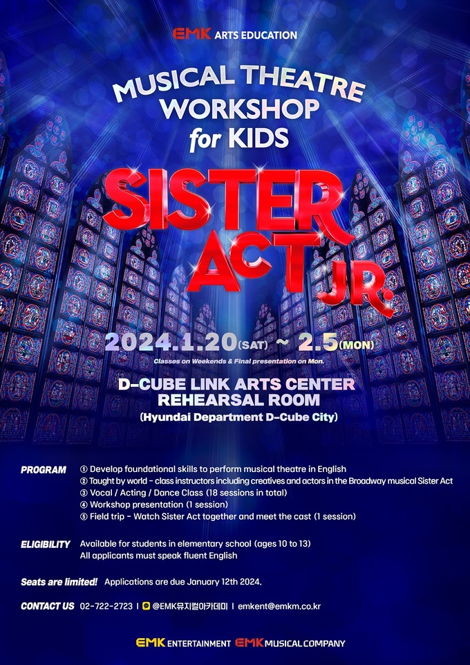 ‘시스터 액트 주니어’ 워크숍은 영어가 가능한 10세에서 13세 사이의 초등학생을 대상으로 하며, 참가 모집은 오는 12일(금)까지 진행된다. 참가 희망자는 전화(02-722-2723), 카카오톡 채널 등을 통해 문의할 수 있다.
