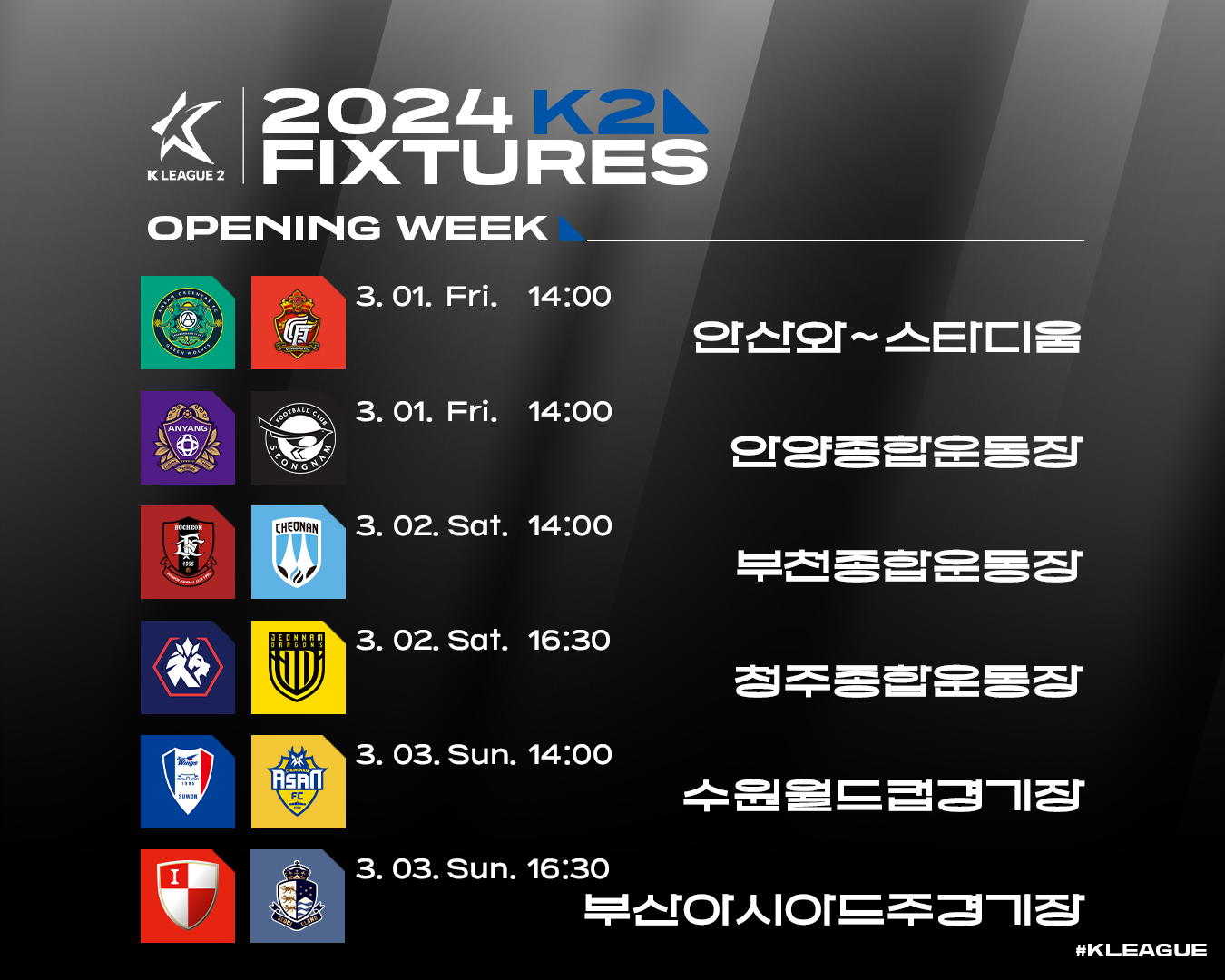 개막 라운드 첫 경기는 3월 1일 오후 2시 안산 와스타디움에서 열리는 안산 대 경남의 경기다. 안산은 지난 시즌 11위에 그쳤지만 올 시즌 반등을 노리고 있다. 경남은 새롭게 부임한 박동혁 감독과 함께 승격 도전에 나선다. 같은 시간 안양종합운동장에서는 안양과 성남이 맞대결을 펼친다.