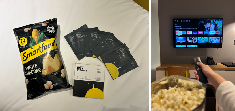 우선, 하루를 마무리하며 좋아하는 드라마, 영화, 애니를 볼 수 있는 OTT를 시청할 수 있는 ‘Mi TV Stick’을 대여해준다. 콘텐츠 감상에서 빠질 수 없는 팝콘이 더해진다. 잠들기 전까지 피곤한 눈을 푹 쉴 수 있도록 온열 아이마스크도 준비했다.