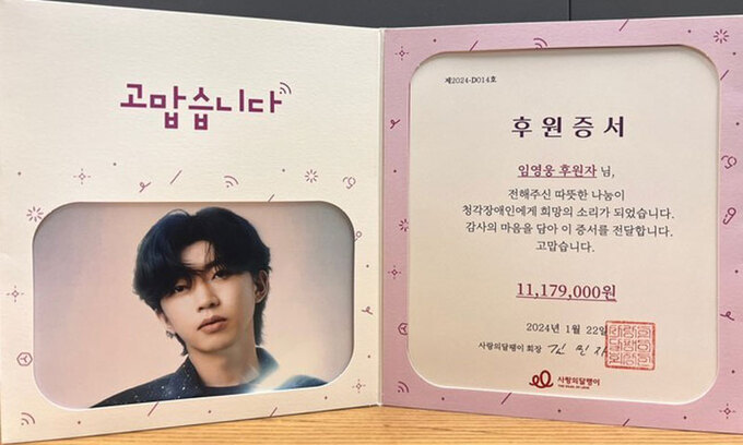 23일 청각장애인을 지원하는 사단법인 사랑의달팽이 측은 가수 임영웅 팬클럽 ‘웅바라기스쿨’ 회원들이 청각장애인 지원을 위해 11,179,000원을 기부했다고 밝혔다.