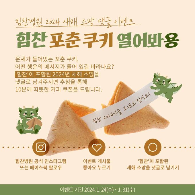 이번에 진행하는 ‘힘찬 포춘 쿠키 열어봐용’ 이벤트는 2024년 푸른 용의 해를 맞아 용처럼 비상하기 위해 이루고 싶은 다양한 바람들을 댓글로 남기면 된다.