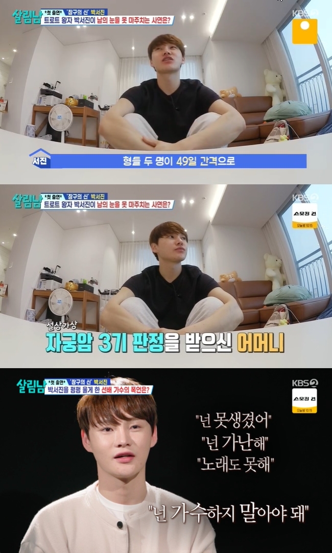 24일 방송한 KBS 2TV ‘살림하는 남자들’ 시즌2 출연한 박서진은 중학교 때를 회상하며 “두 형이 49일 간격으로 죽었다. 큰 형은 간 이식 수술을 받았는데 잘못돼 죽었고, 작은 형은 만성신부전증이었다. 당시 엄마는 자궁암 3기 판정을 받았다”고 밝혔다. 그는 “아버지와 배를 타기 위해 고등학교를 자퇴했다”고 밝혔다.