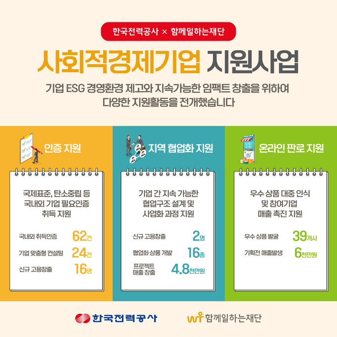 한국전력공사(사장 김동철)와 함께일하는재단(이사장 이세중)은 기업 ESG 경영환경 제고와 지속가능한 임팩트 창출을 위한 “23 한전 사회적경제기업 지원사업”을 운영, 마무리했다고 1일 밝혔다.