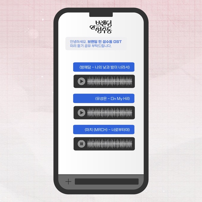 OST 제작사 ㈜블렌딩은 5일 공식 유튜브 채널을 통해 ‘브랜딩 인 성수동’ (기획: STUDIO X+U, 제작: STUDIO X+U, STUDIO VPLUS, 공동제작: 하이그라운드 /크리에이터: 최선미, 연출: 정헌수, 극본: 최선미, 전선영)의 OST 하이라이트 메들리를 공개했다.