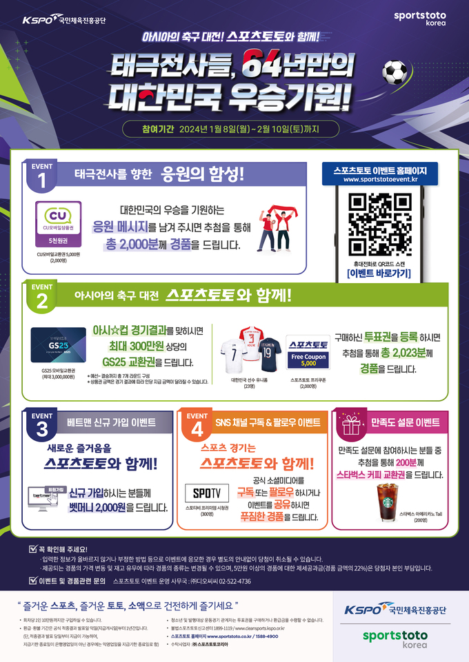 ‘태극전사들, 64년 만의 대한민국 우승기원!’은 스포츠토토코리아가 국내 스포츠팬들과 함께 카타르 아시안컵에 진출한 대한민국 축구 대표팀의 우승을 염원하기 위해 마련한 이벤트다. 이중 ‘아시아의 축구대전 스포츠토토와 함께!’는 각 라운드에 제시된 경기들의 결과를 맞히는 방식으로 참여가 가능하다. 6일 오후 11시 50분까지 아시안컵 준결승전을 대상으로 6라운드를 진행하며, 이번 라운드에서는 250만원 상당의 GS편의점 교환권을 적중 건수에 따라 배분 지급한다.