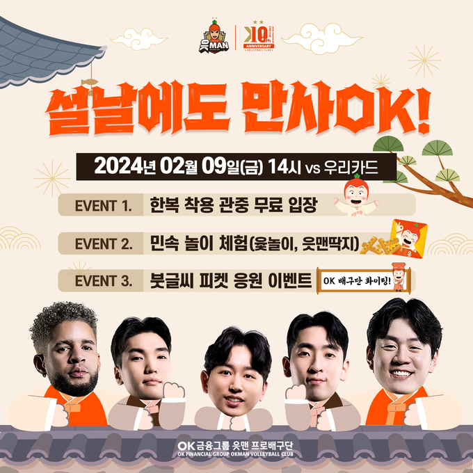 남자프로배구 OK금융그룹은 7일 “설 연휴 첫날인 9일 안산 상록수체육관에서 열리는 도드람 2023∼2024 V-리그 남자부 5라운드 우리카드와 홈경기에서 설 명절과 걸맞은 다양한 이벤트를 준비했다”고 밝혔다.