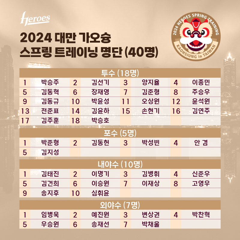 키움이 오는 11일부터 3월 12일까지 총 31일간 대만 가오슝 국경칭푸야구장에서 2024시즌 퓨처스팀 스프링캠프를 실시한다.