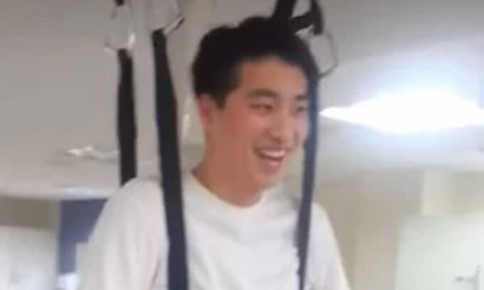 영상 속 박위는 보행을 돕는 재활 로봇을 이용해 걷고 있는 모습. 걷는 것에 성공한 박위는 환하게 미소지었다.