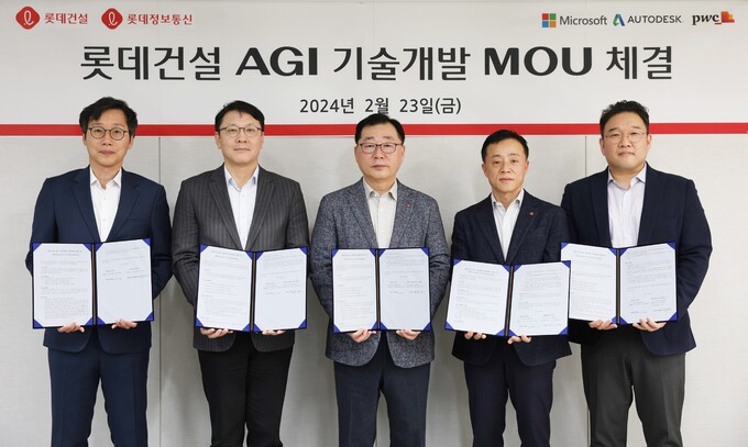 롯데건설과 롯데정보통신은 지난 23일 서울 서초구 잠원동 롯데건설 본사에서 한국마이크로소프트, 오토데스크코리아, PwC컨설팅과 AGI 기술개발 업무협약(MOU)을 체결했다.